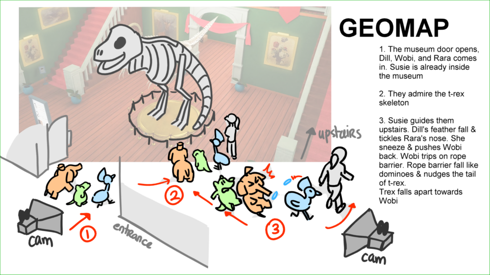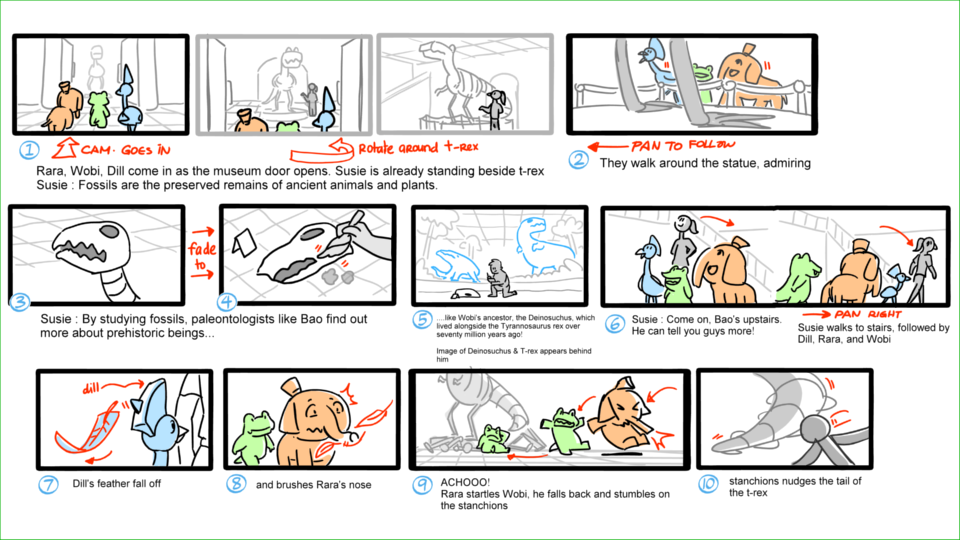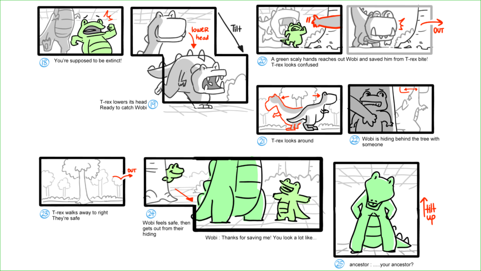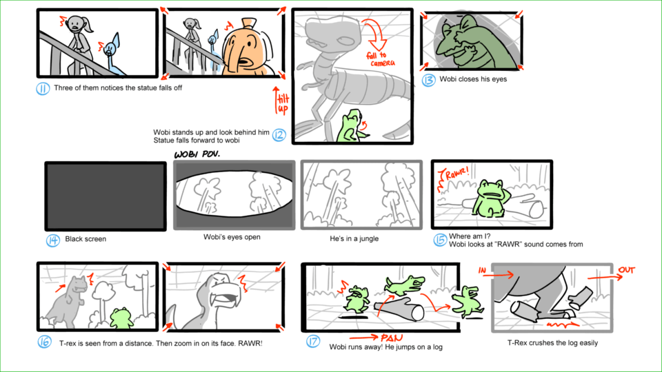 Wobi is knocked unconscious by a t-rex statue and then brought to his dream when Dinosaurs are still alive. Property of Scrawl Animation Studio.
